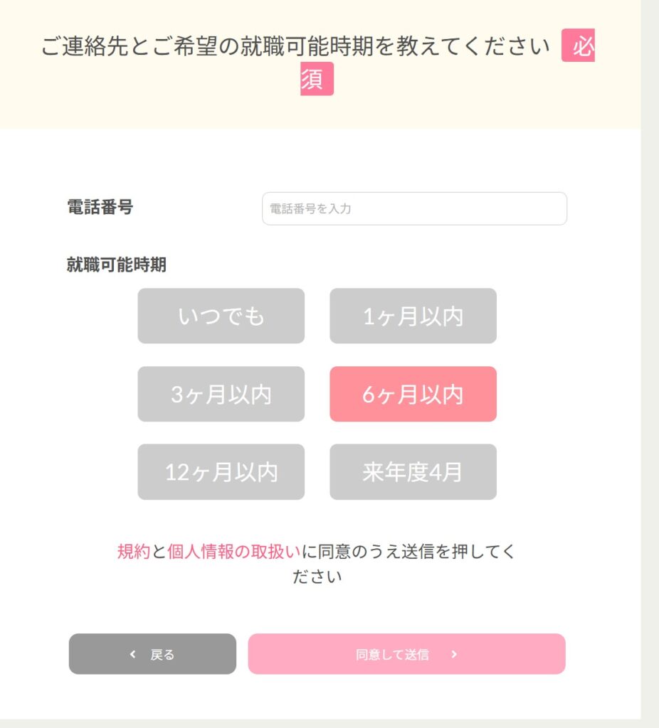 電話番号と希望の勤務開始時期を入力